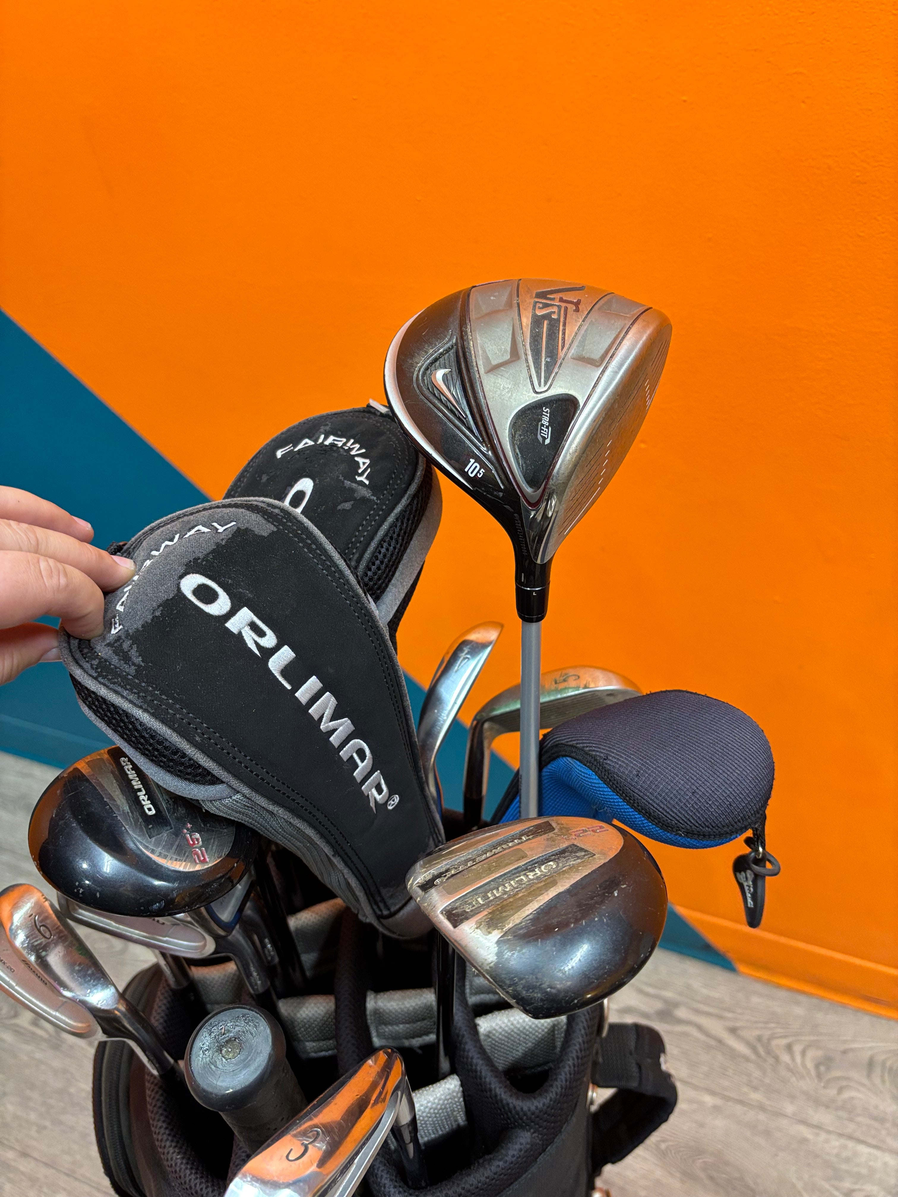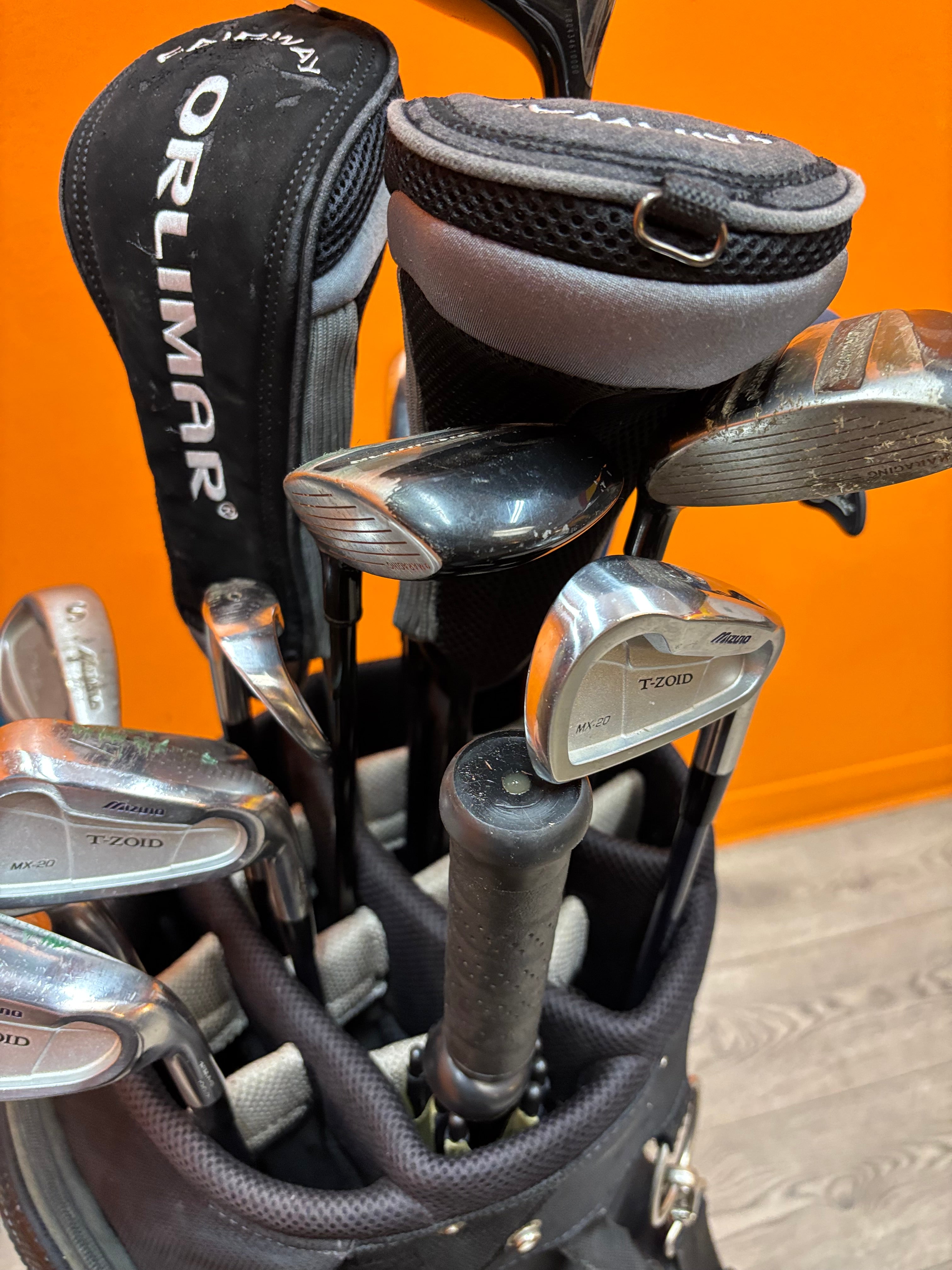 Things you might like to know: 16 Golf Clubs in total. Inside the bag is: Mizuno MX-20 6, 4, 5, 3, 8, 7, P, 9, an umbrella, Mizuno Tour Wedge 56 degree (5), Orlimar 18 degrees, Orlimar 26 degrees, Nike VR_S STR8-FIT 10 5, Orlimar 14 degrees (3), Orlimar 22 6, PING W ni 475-22, Mizuno Tour 910. All of these clubs are not recent they are approx. 1990s-2000s. Inside golf bag is the cover to put on top of the clubs while travelling.